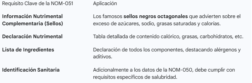 Esta norma es más estricta y se centra en la información nutrimental y, crucialmente, en los sellos de advertencia sanitaria.